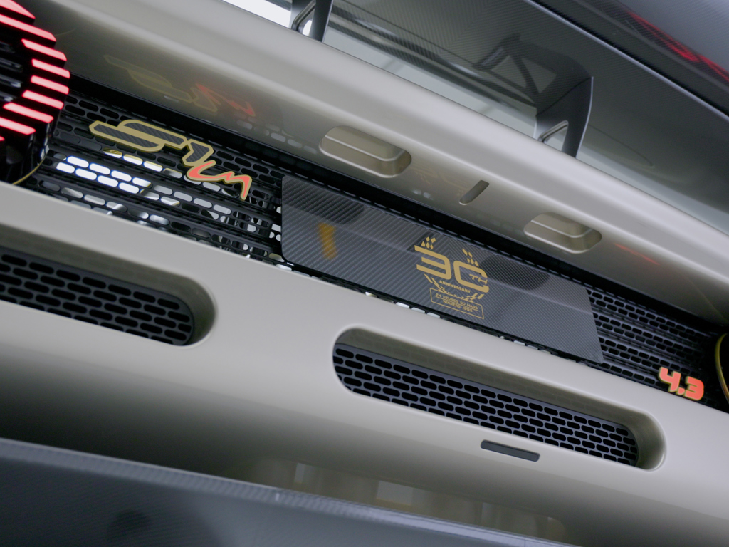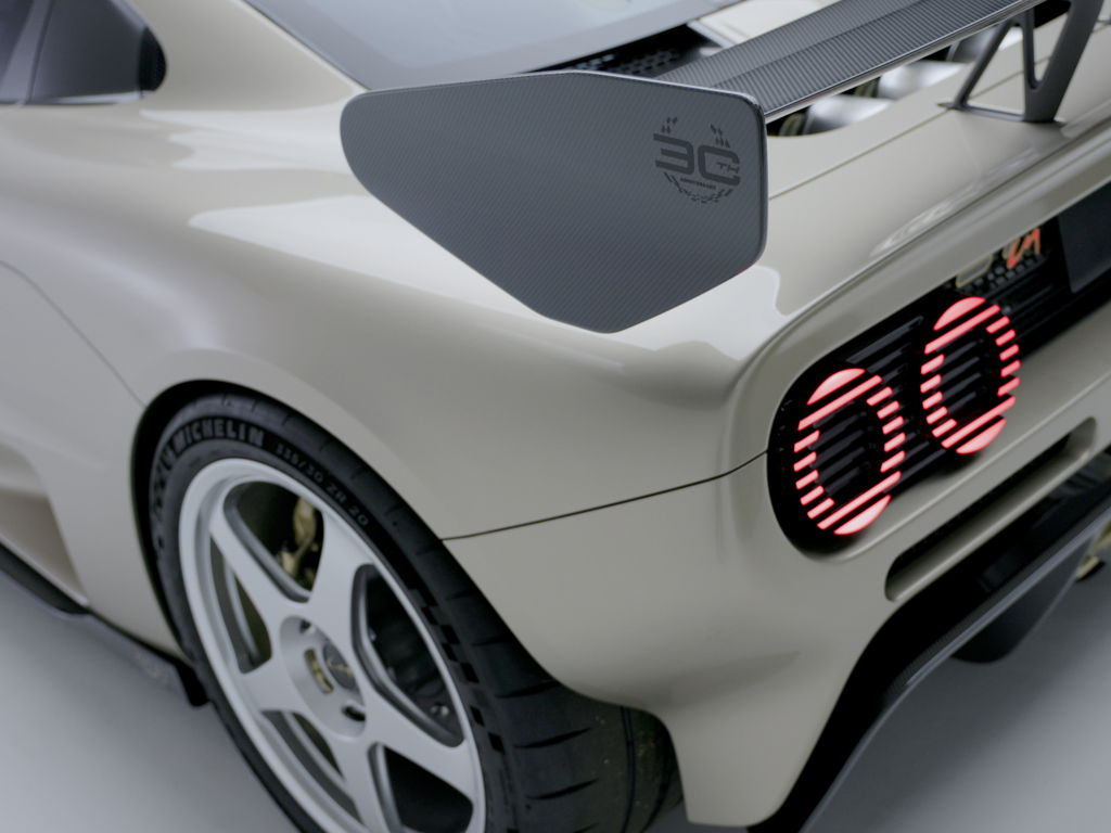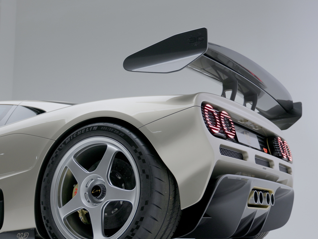 This is a rare Gordon Murray Special Vehicles S1 LM, celebrating the 30th anniversary of McLaren F1 GTR's Le Mans victory. Designed by the creator of the McLaren F1, it features a bespoke 700+ HP Cosworth V-12 engine and a lightweight design, offering a peak analog driving experience.