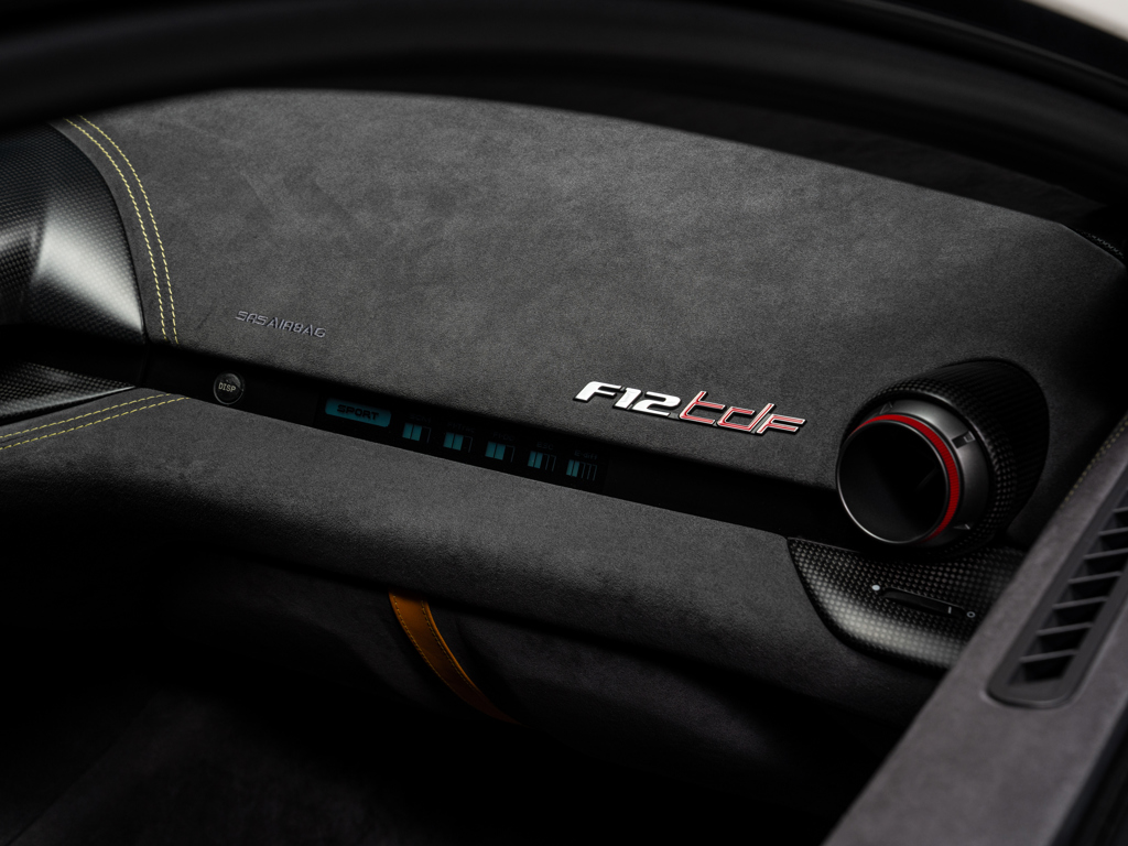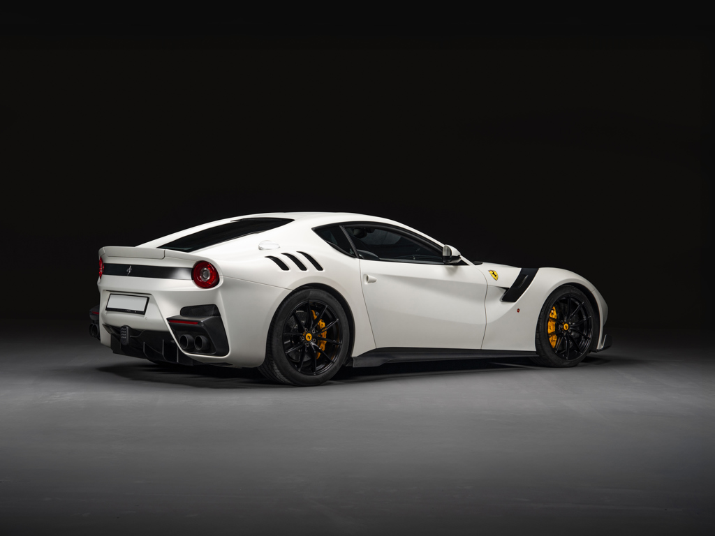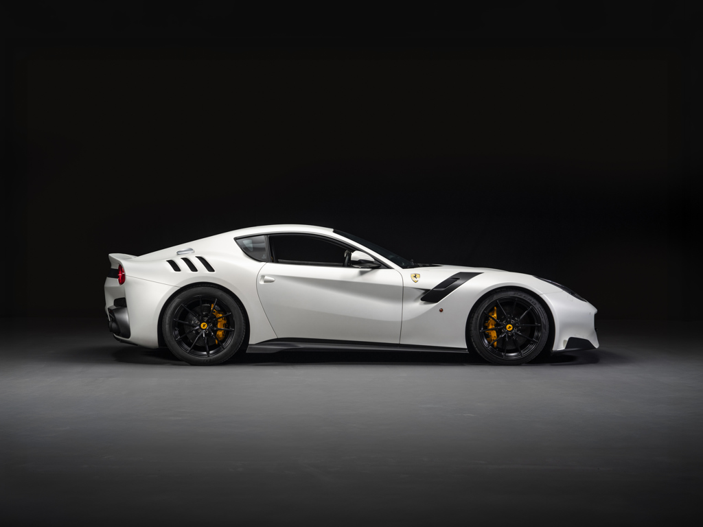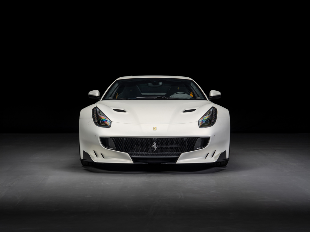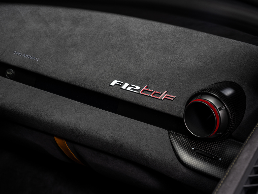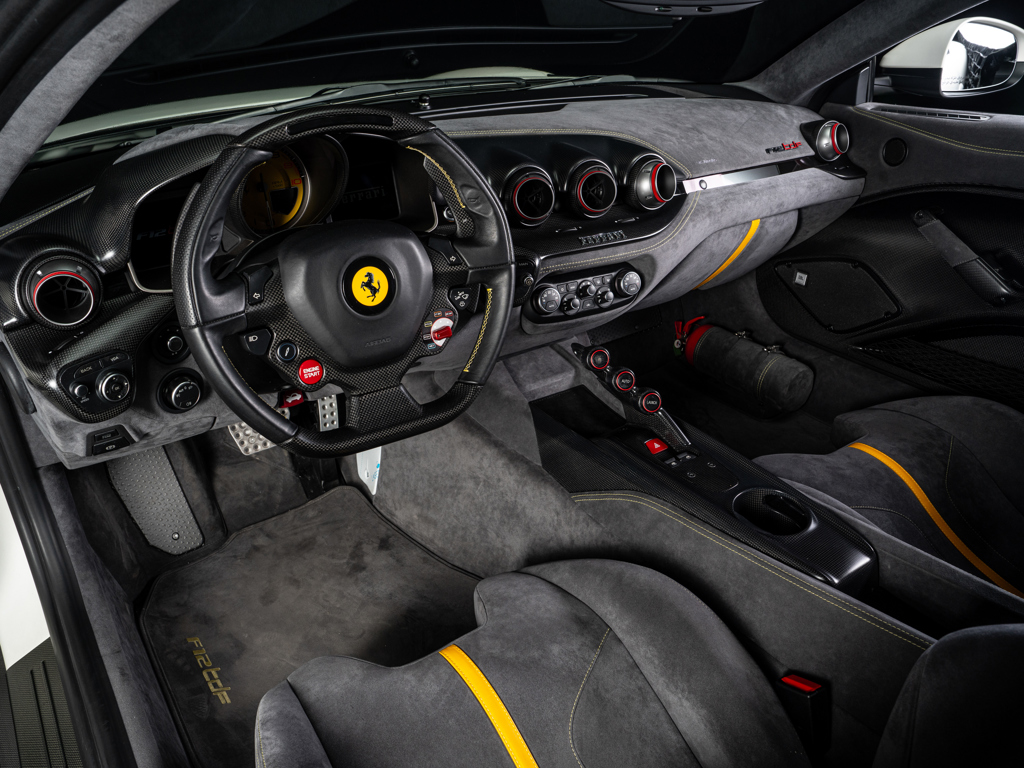 One of 799 examples of the F12tdf built between 2015 and 2017 Stunning specification: extra-range Bianco Italia Opaco exterior with matte carbon fibre accents over a Charcoal interior with Giallo accents Delivered new via, and serviced annually by, Kuwait Automobile & Trading Co; driven a modest 10,322 kilometres at the time of cataloguing Powered by a 6.3-litre, naturally aspirated V-12 factory-rated at 769 horsepower Capable of 0-100 km/h in 2.9 seconds; good for a top speed of 340 km/h