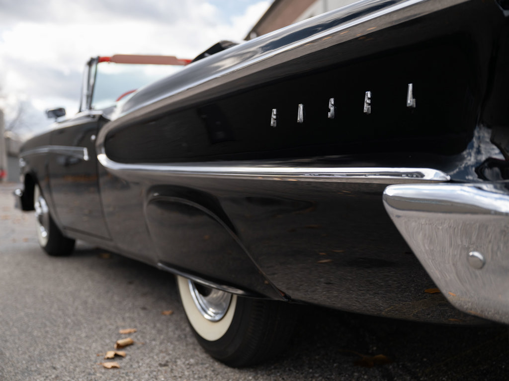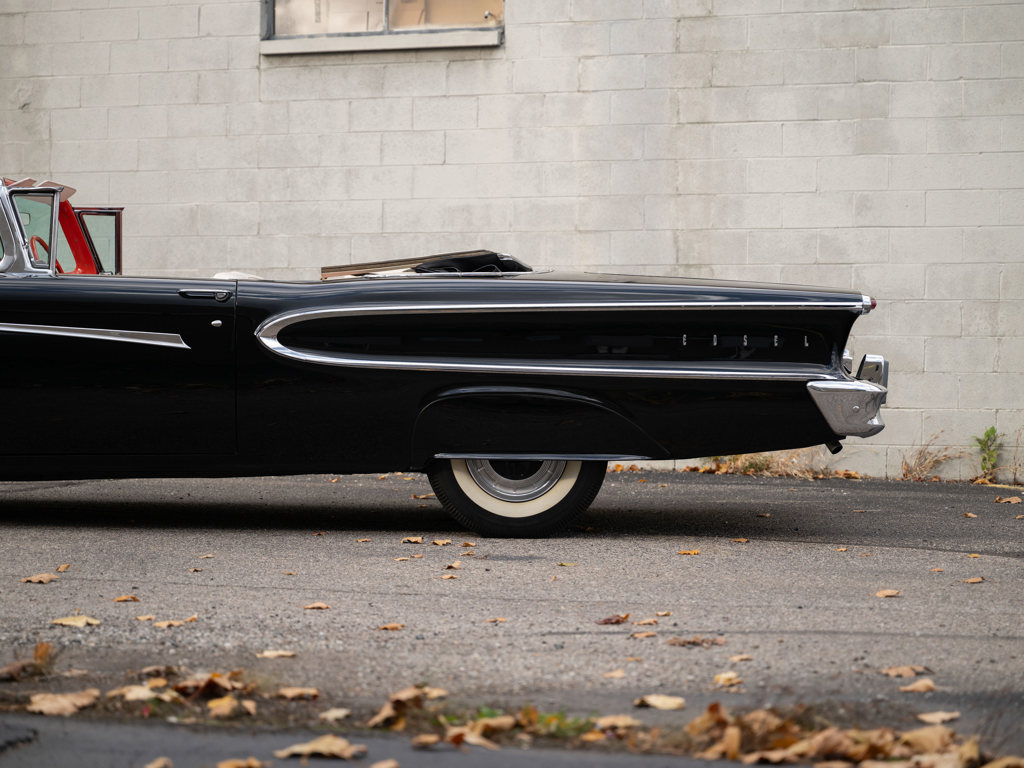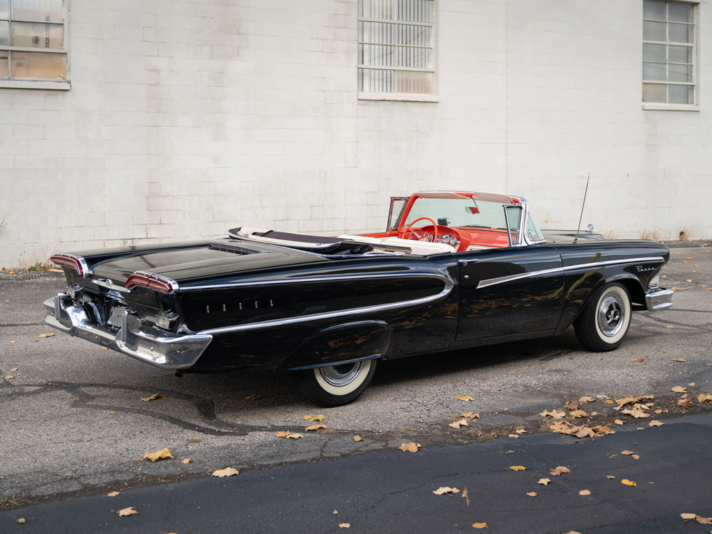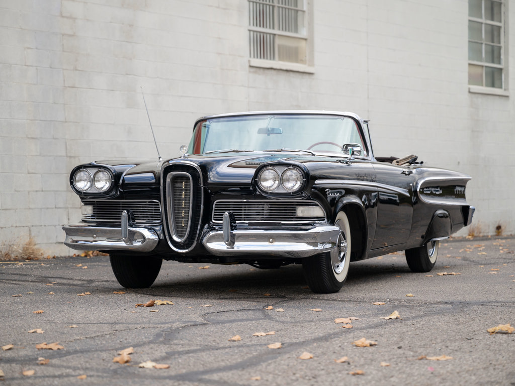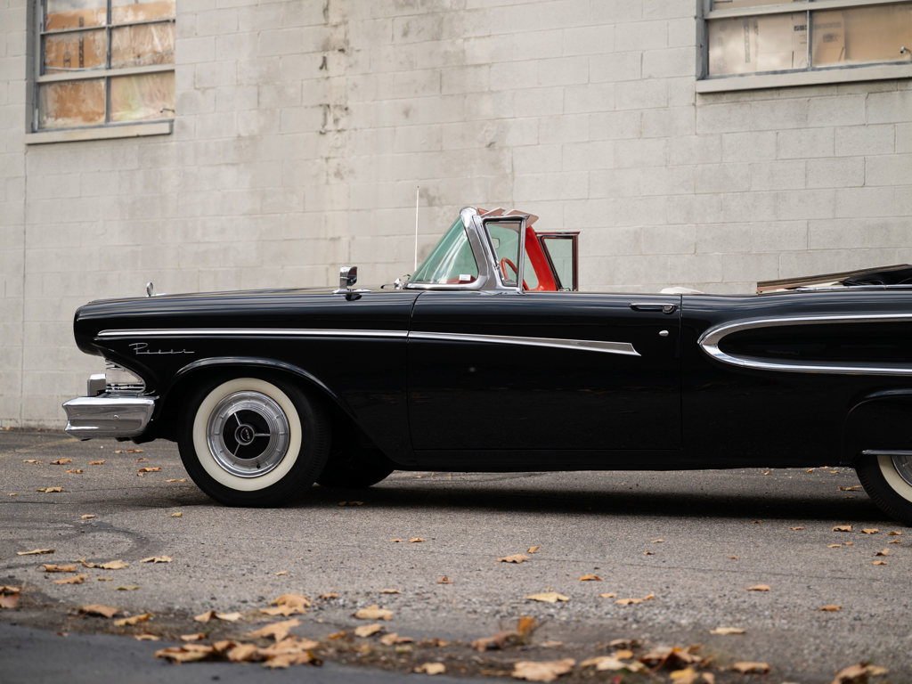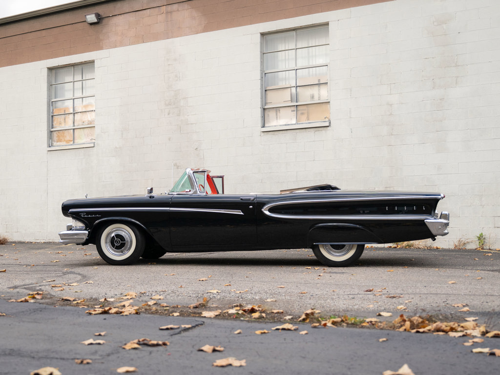 Offered Without Reserve | $60,000 - $70,000 USD First year of Ford’s fabled Edsel line, produced for only three yearsOne of 1,876 Pacer Convertibles built for 1958, the model's rarest variant that yearStriking color scheme of black over two-tone white and red Signature avant-guard design and novel features, including Teletouch Drive Powered by a 361-cid V-8 rated at 303 hpA rare offering from a fascinating chapter in Ford's history Named after Henry Ford’s son and advertised as the “Newest thing on wheels,” the Edsel brand was a highly anticipated expansion of Ford’s Lincoln-Mercury lineup with the goal of gaining market share from Chrysler and General Motors.