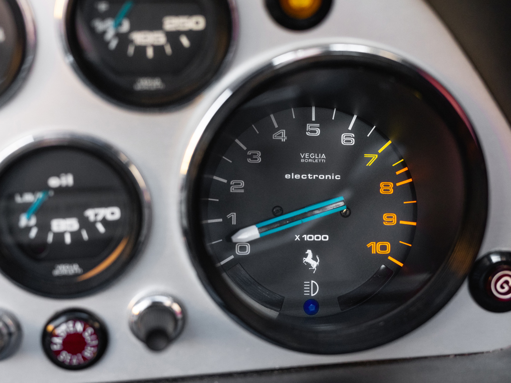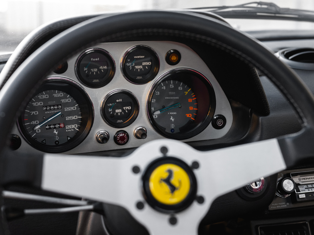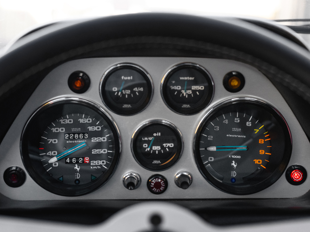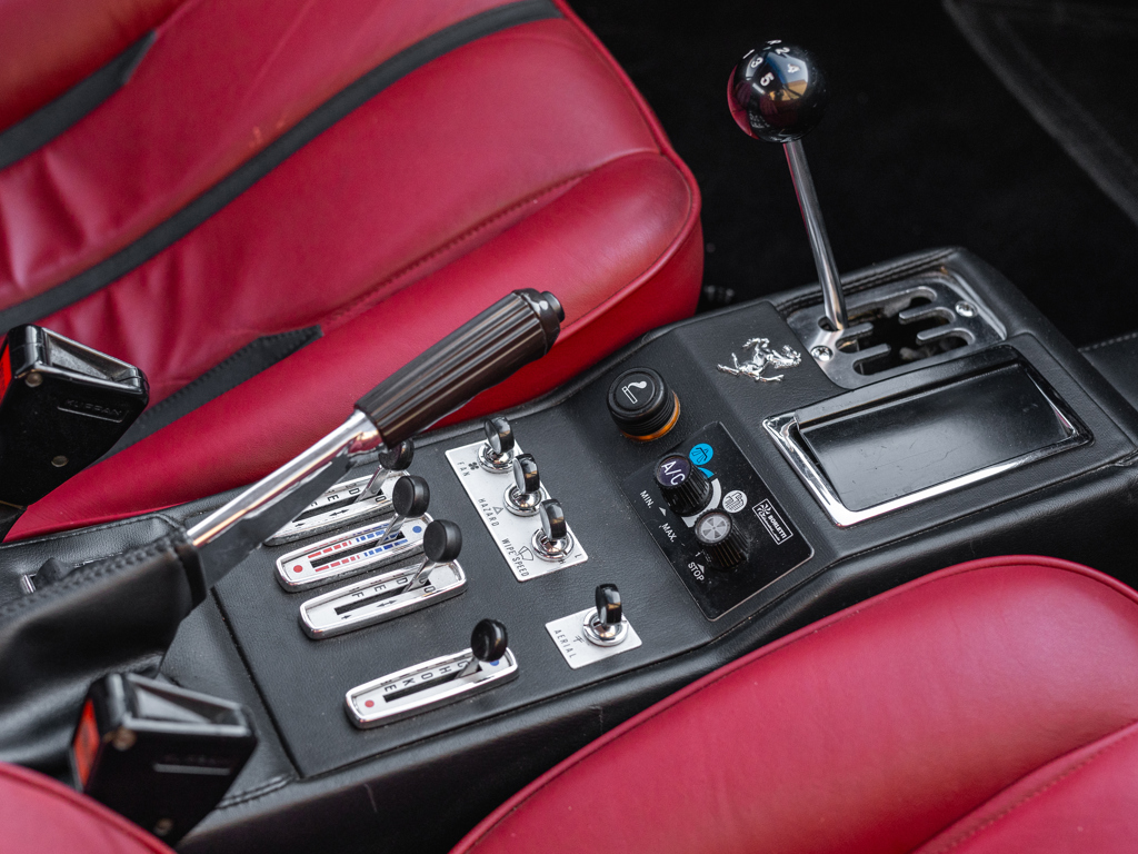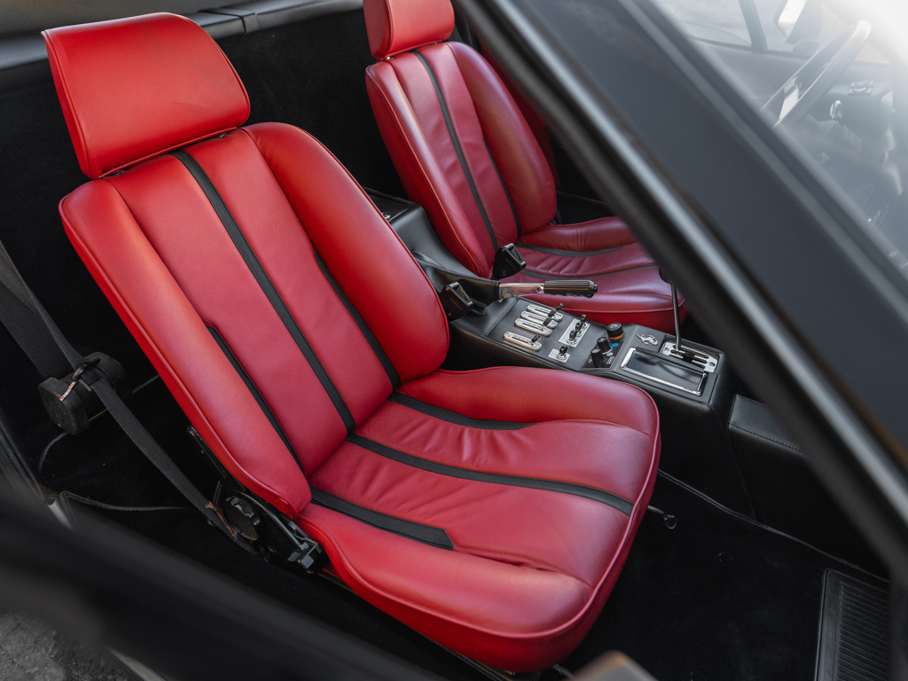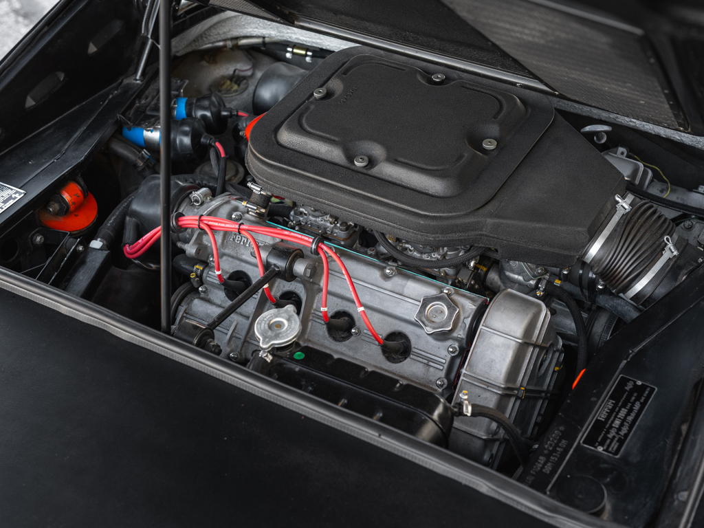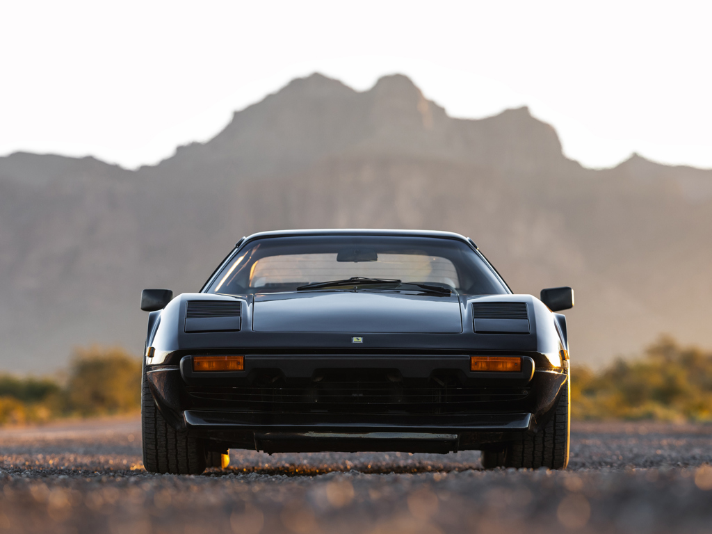 Its 2.9-liter dual-overhead-cam V-8, mounted transversely behind the cabin and paired with a five-speed manual transaxle, offered crisp throttle response through four Weber DCNF downdraft carburetors with a spine-tingling exhaust note.