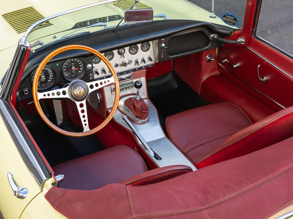 This 1964 Jaguar E-Type Series 1 Roadster, prominently featured in 'The Wolf of Wall Street,' is a numbers-matching example with a JDHT Production Record Trace Certificate. Restored in the 2000s and finished in Primrose Yellow over red leather, it's located in Phoenix, Arizona.