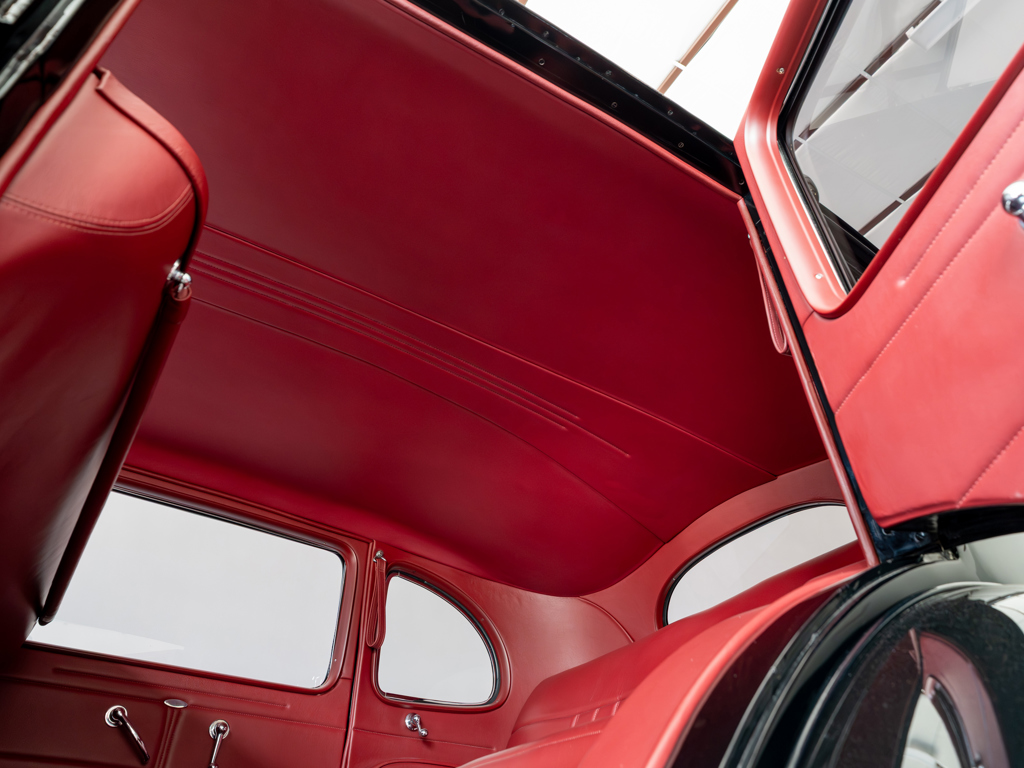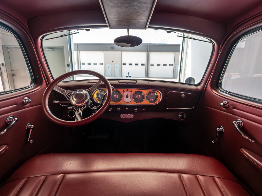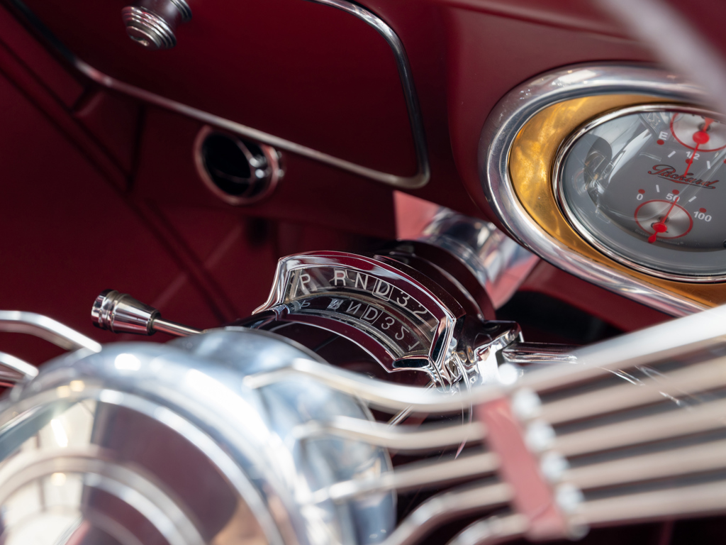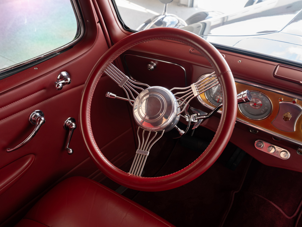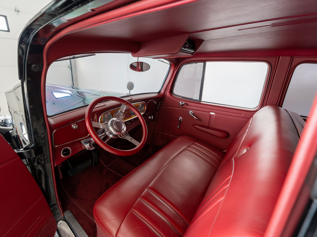 Powered by a modified Chevrolet LS3 V-8 estimated to produce 560 hp Equipped with power steering, front disc brakes, and air conditioning for improved drivability and comfort Maintains elegant pre-war looks with whitewall tires, chrome brightwork, and other period features Nicely appointed interior with well-padded seats covered in red leather A highly capable machine for touring and showing