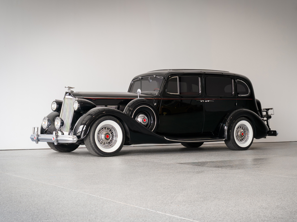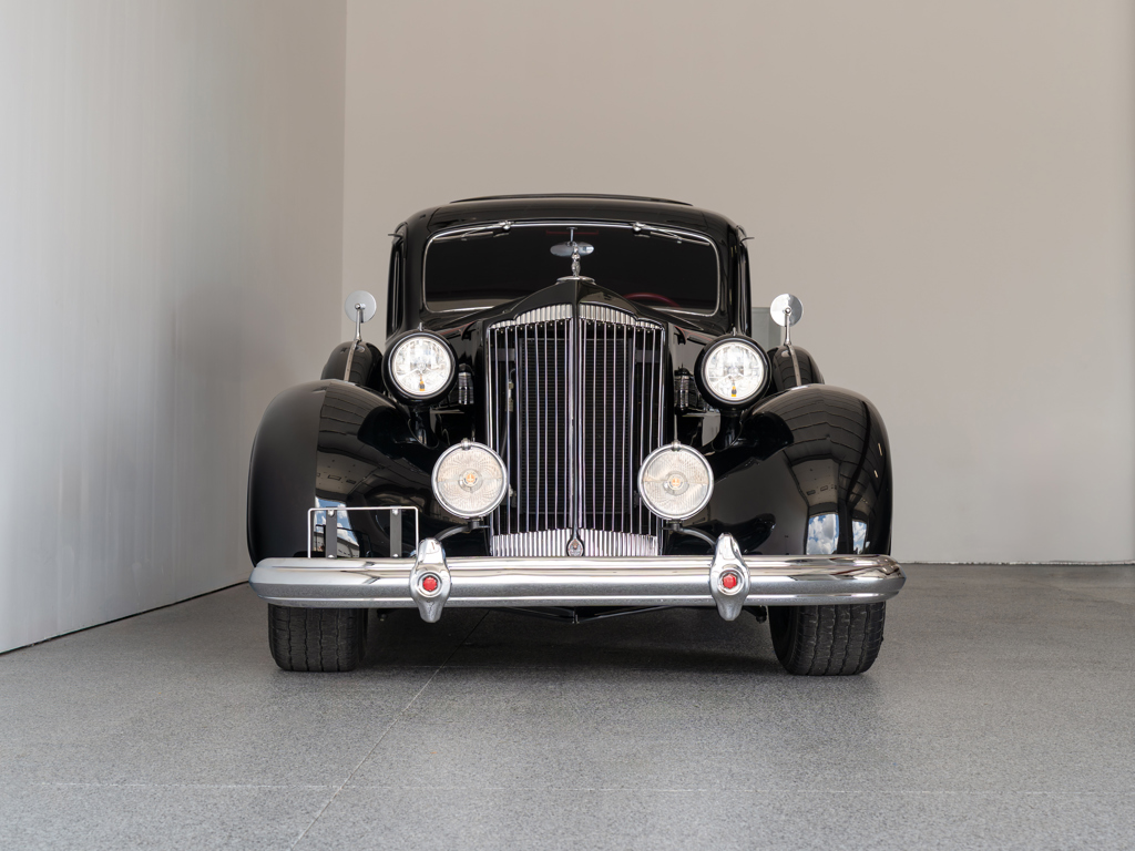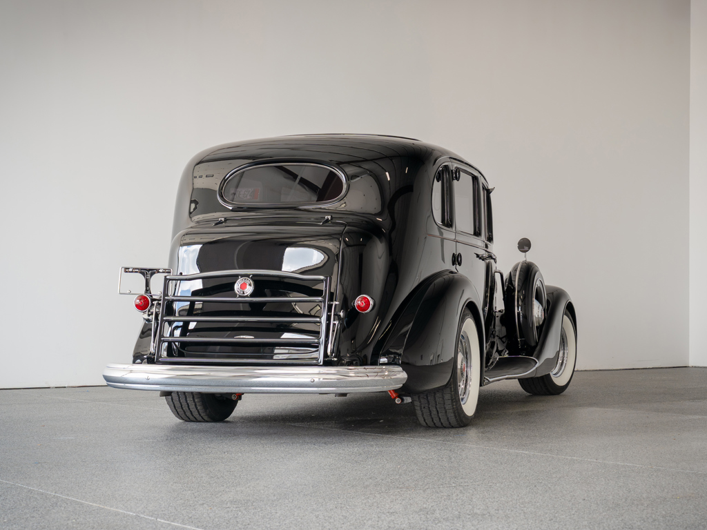 This 1937 Packard is a custom touring sedan with a modified Chevrolet LS3 V-8 engine producing 560 hp and modern upgrades for improved drivability. It features a nicely appointed red leather interior and elegant pre-war aesthetics, making it suitable for both touring and showing.