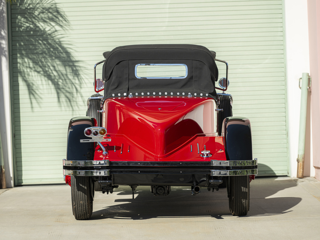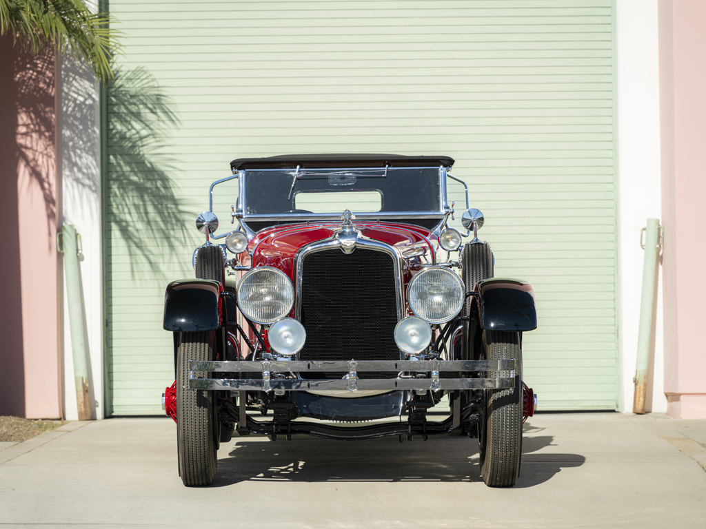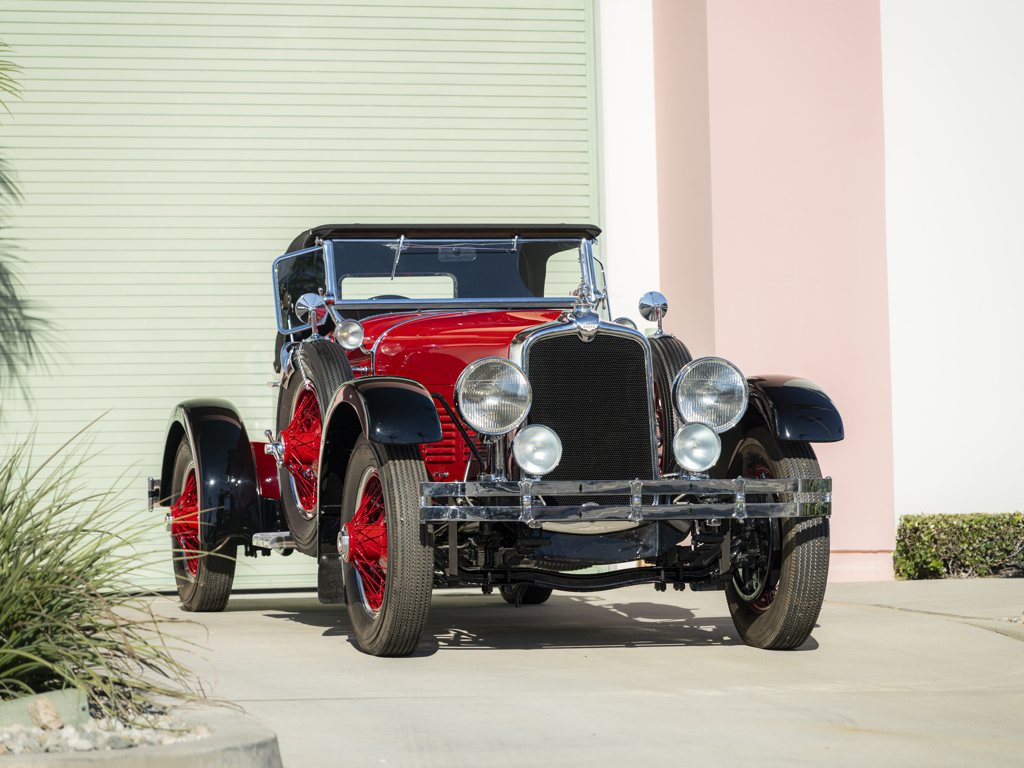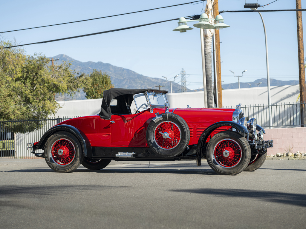 This 1928 Stutz Black Hawk Speedster, a right-hand-drive model, is offered without reserve at auction to benefit charity. An older restoration in scarlet with black fenders, it is an extremely beautiful representation of one of the most famous Stutzes.