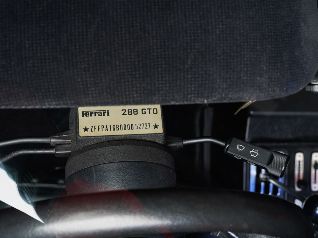 This 1985 Ferrari 288 GTO is a rare, low-mileage example with only one owner from new. It has Ferrari Classiche certification and matching numbers, making it highly desirable for collectors.