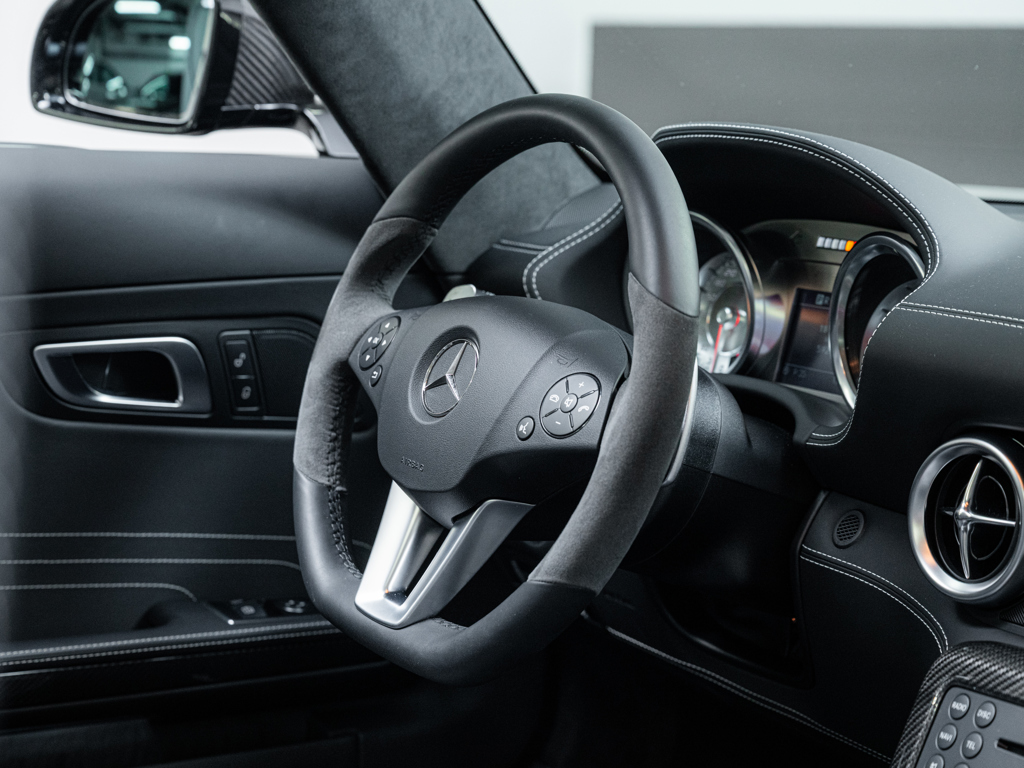 €180,000 - €230,000 EUR Finished in Obsidian Black with a black fabric roof over Black and Anthracite leatherDesirably equipped with an AMG performance steering wheel, carbon interior and exterior trim, ceramic brakes, Airscarf system, plus AMG forged wheelsThunderous 6.2-litre naturally aspirated V-8 delivers 563 horsepower via a seven-speed dual-clutch transmissionJust two German owners from new; delivered in Munich in November 2012Catalogued showing 6,044 kilometres on the odometer An homage to the legendary Mercedes-Benz 300 SL and the home of a raucous 6.2-litre naturally aspirated V-8 engine, the SLS AMG Roadster channels its 563 horsepower via a seven-speed dual-clutch transmission to achieve a claimed 317 km/h top speed.