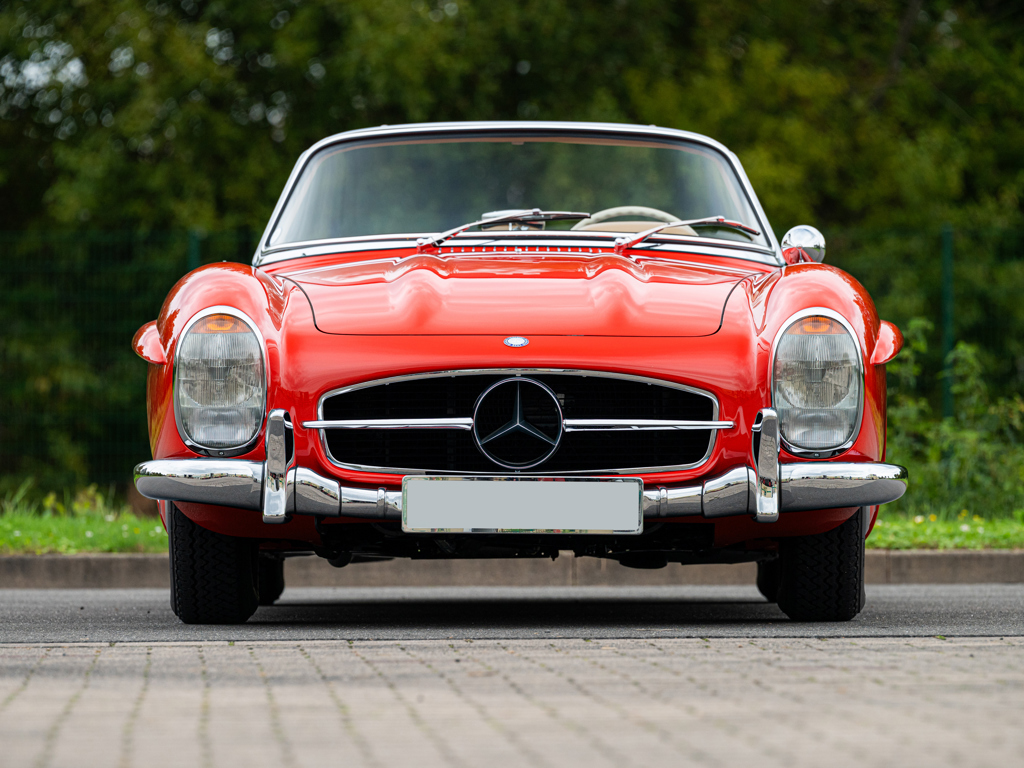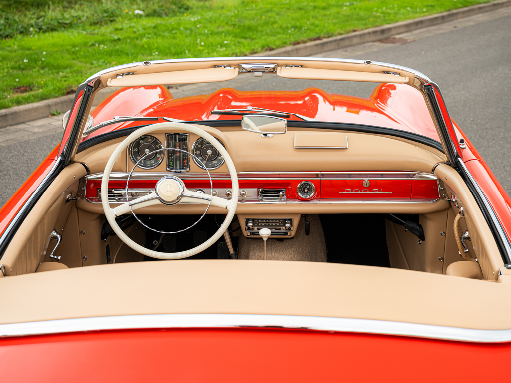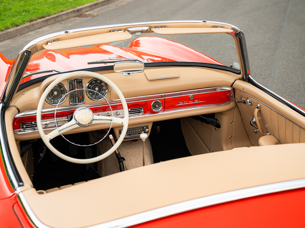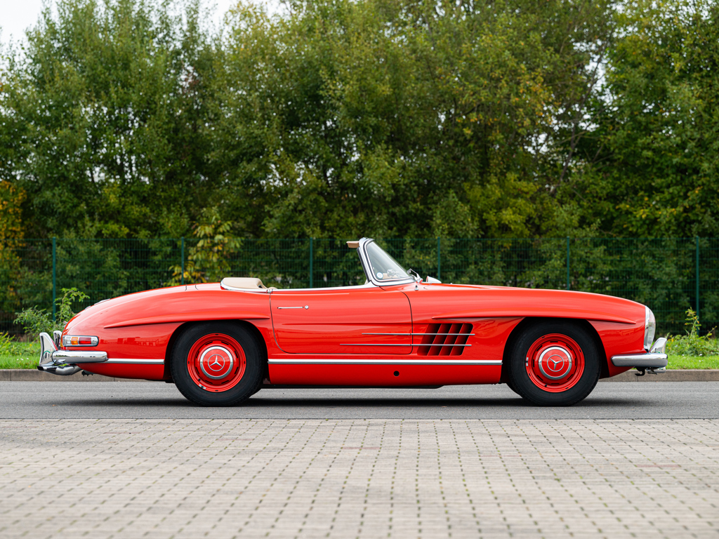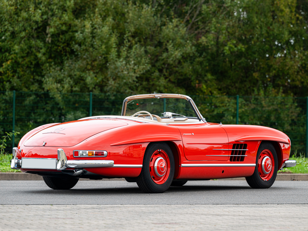 €1,200,000 - €1,500,000 EUR One of 182 examples of the 300 SL Roadster produced in 1962Delivered new to England in January 1962; later exported to GermanyPresents in its factory-correct colour combination of Fire Engine Red over Cream leatherRestored by Mercedes-Benz Classic between February 2015 and September 2016Matching-numbers body, engine, gearbox, rear axle, plus left and right front axlesAccompanied by factory data card copy and Mercedes-Benz Classic restoration book To reinvigorate the 300 SL as production of the competition-bred Gullwing coupé came to an end in 1957, Mercedes-Benz unveiled a beautiful Roadster successor.