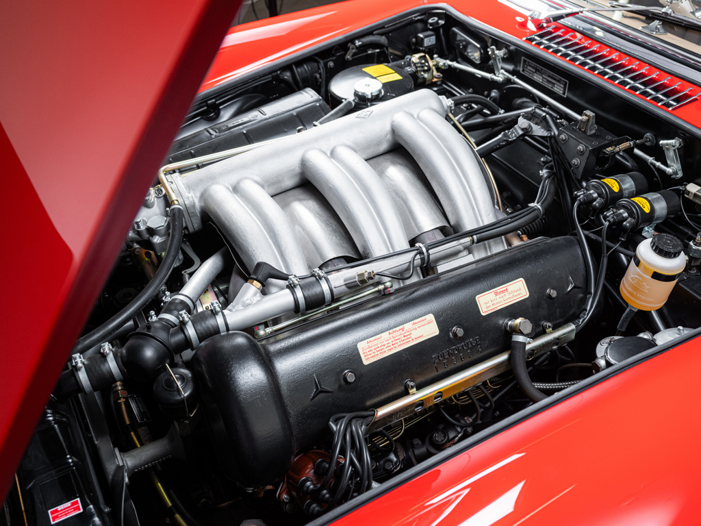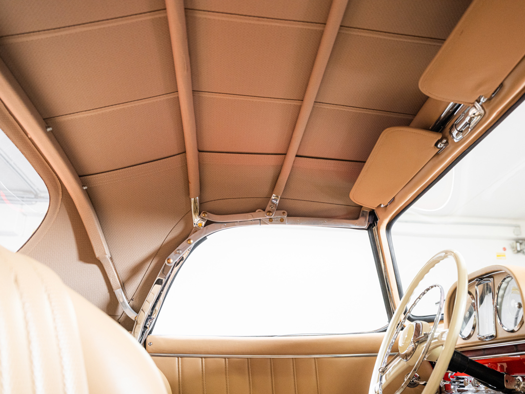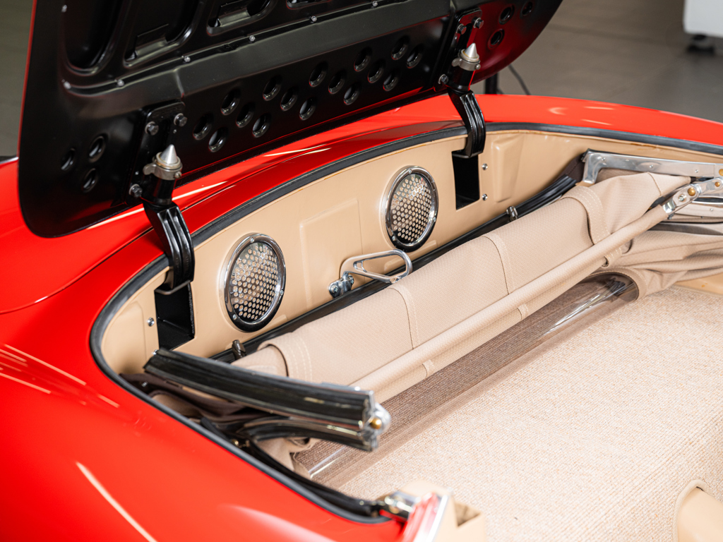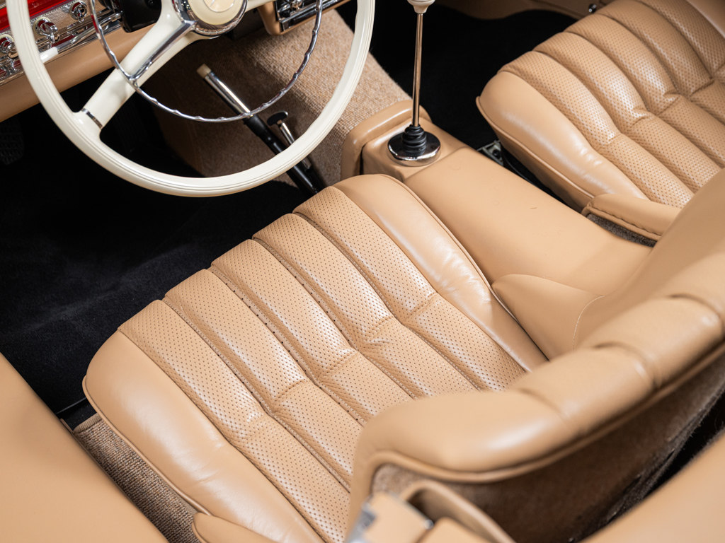 This 1962 Mercedes-Benz 300 SL Roadster, presented in Fire Engine Red over Cream leather, is one of 182 examples produced. It features matching-numbers components and was meticulously restored by Mercedes-Benz Classic, making it an outstanding example.