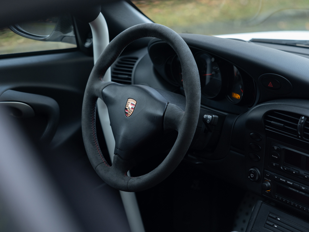 Offered solely in Carrera White, the model’s side decals and wheels (in either red or blue) gave a nod to the first road-going Porsche to carry the RS moniker: the 911 Carrera 2.7 RS.The example offered here was delivered new via the Monegasque car dealer, Po...