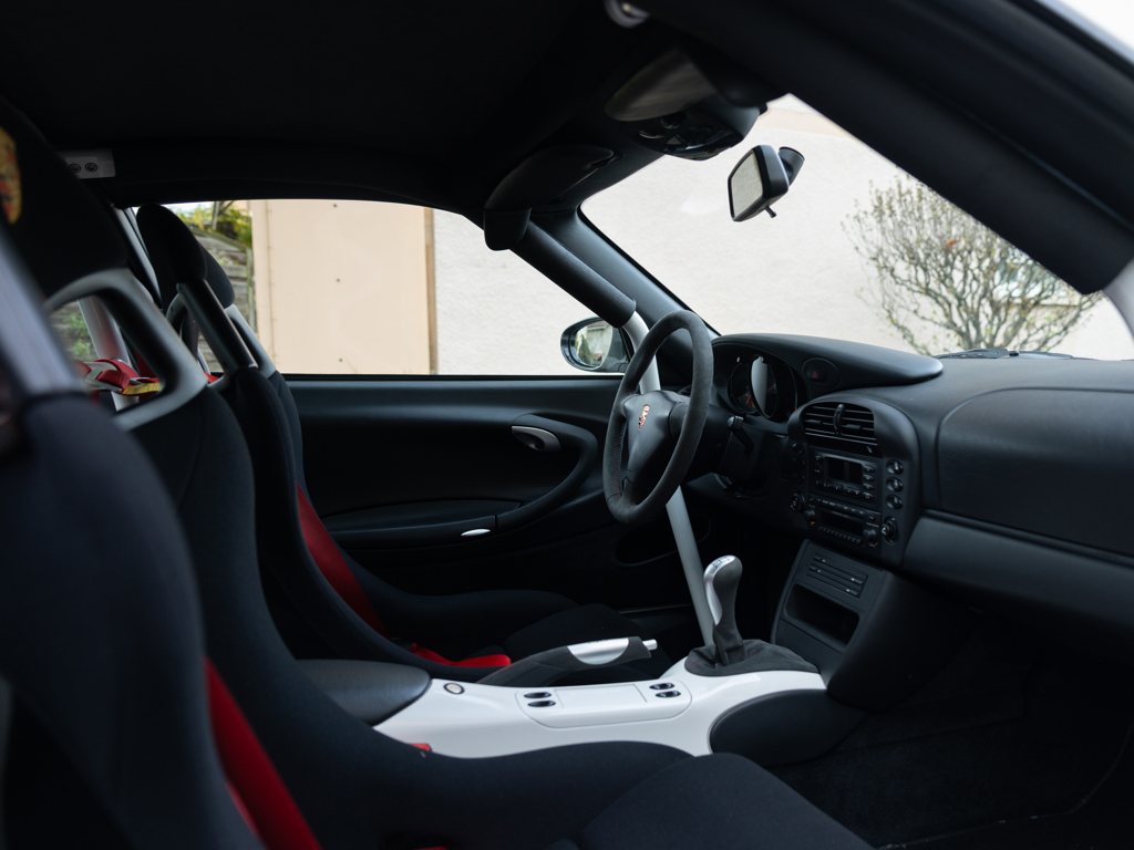 This 2004 Porsche 911 GT3 RS, one of 682 examples, is finished in Carrera White with red accents and has only 9,100 kilometers. Sold new in France, it comes with original books and optional extras like air conditioning and Bi-Xenon headlights, making it a desirable collector's item.