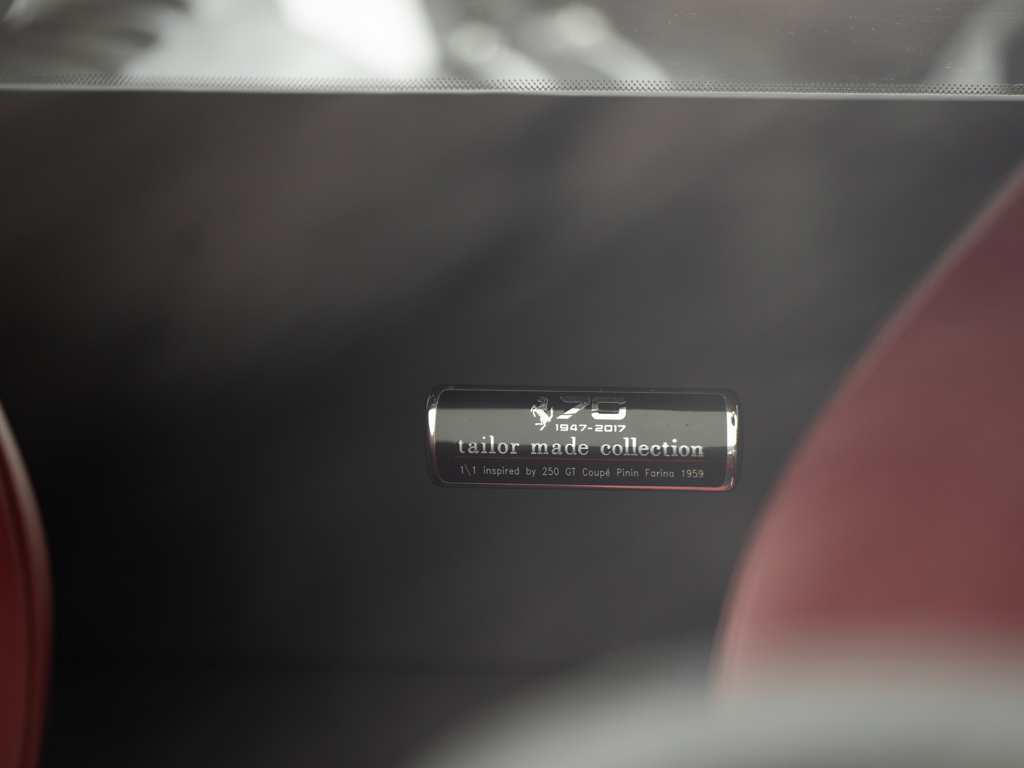 $350,000 - $400,000 USD One-of-one 488 GTB 70th Anniversary finished in livery number 26, “Some Like it Red”Inspired by the signature color scheme of the iconic 1959 Ferrari 250 GT Coupe Pinin FarinaExterior in Rosso Mugello with contrasting Argento Nürburgring roof and mirror capsInterior finished in Vinaccia and Charcoal leatherSold new through Algar Ferrari of Philadelphia; showing 4,500 miles at cataloguing time Accompanied by window sticker, factory books, and 70th Anniversary Grey Book To celebrate its 70th anniversary, Ferrari created a limited run of 70 bespoke liveries through its exclusive Tailor Made department, each inspired by a significant model from the company’s past and applied to just one example of the five production models available at the time—the California T, 488 GTB, 488 Spider, GTC4Lusso, and F12berlinetta—for a limited run of 350 singular, celebratory cars.