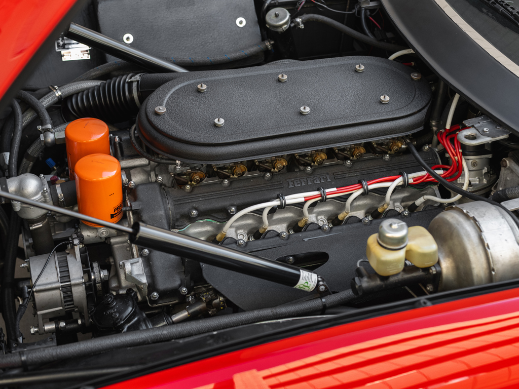 A model originally envisioned and designed for the American market, this is where this particular car would be destined, finished in Rosso Chiaro (20-R-190) over a Nero (VM 8500) Connolly interior with red seat inserts.