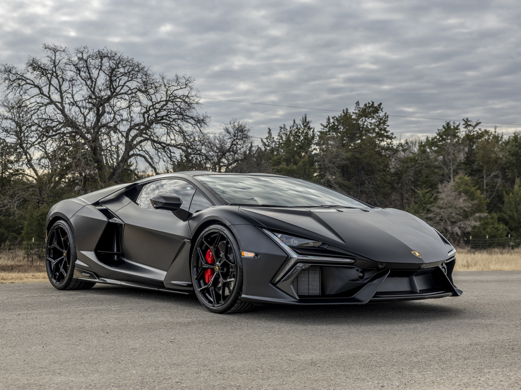This 2024 Lamborghini Revuelto, Lamborghini’s first plug-in hybrid supercar, is offered with very low mileage. It features a Nero Nemesis matte paintwork, Nero leather interior with red accents, and $112,700 in factory options.