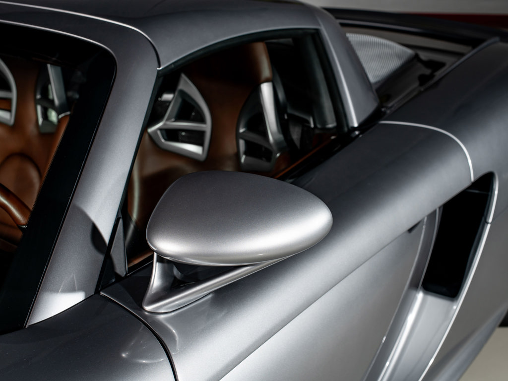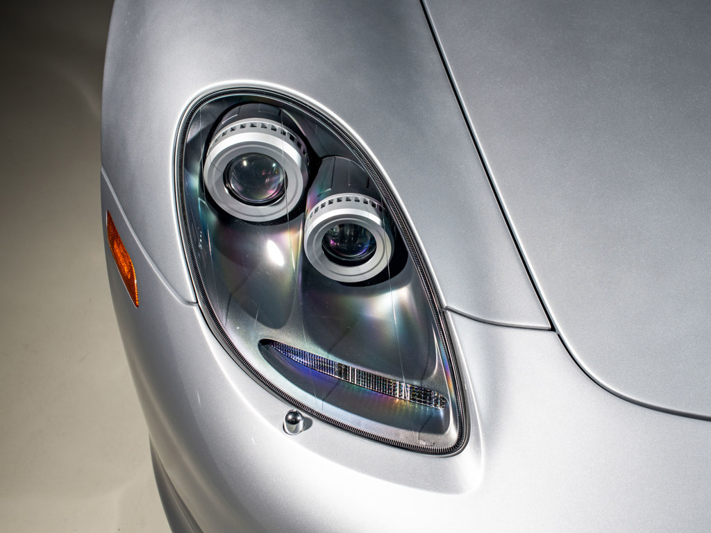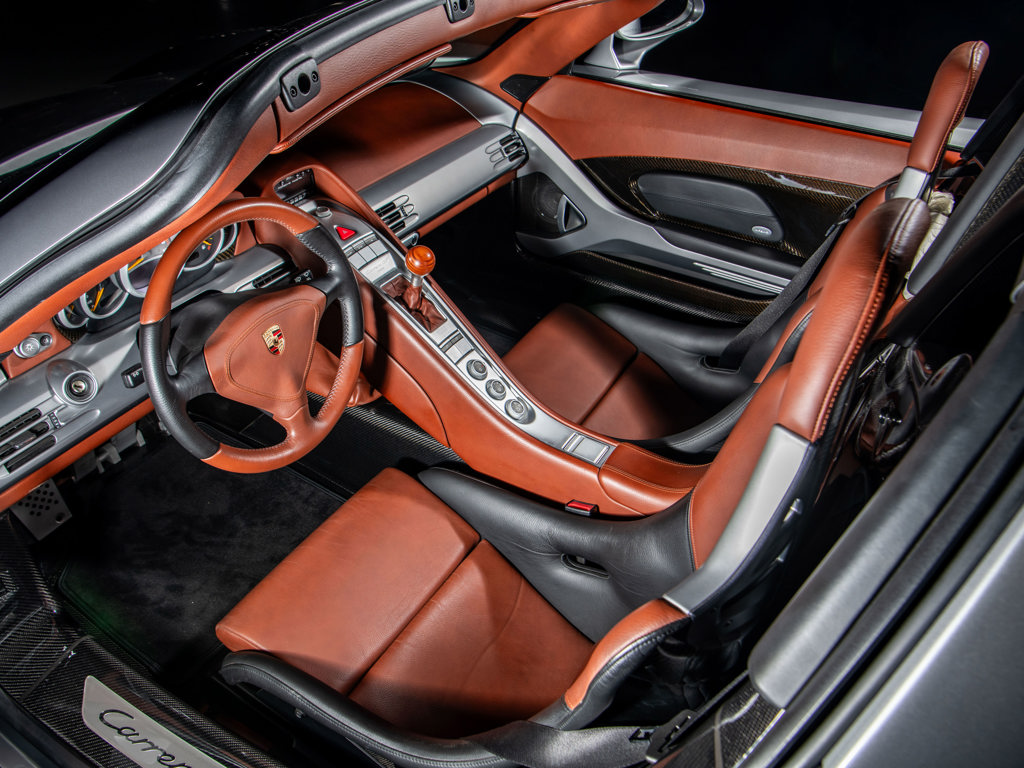 This 2005 Porsche Carrera GT, offered from the Drift Capital Collection, is a US-market example with only 603 miles. Finished in GT Silver Metallic over Ascot Brown and Natural Black leather, it boasts a recent $89,000 service and comes with numerous accessories, making it a highly desirable analog masterpiece.