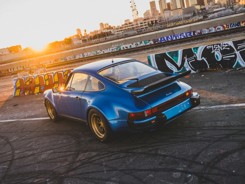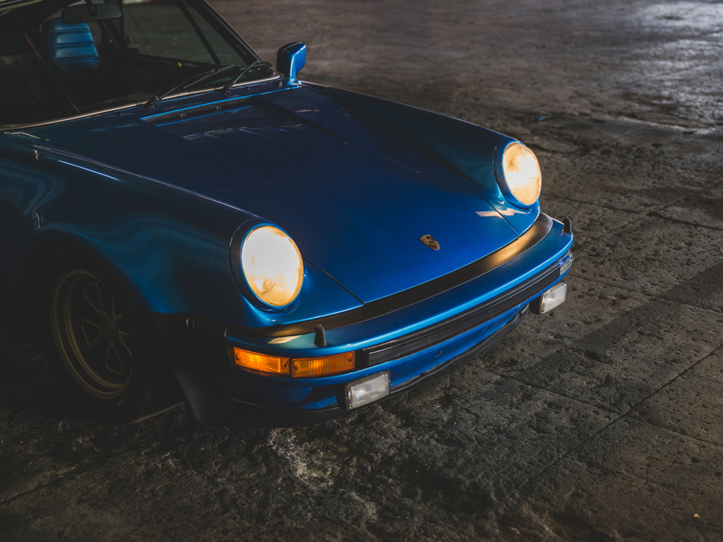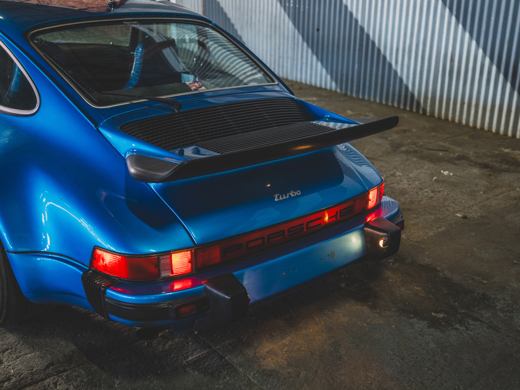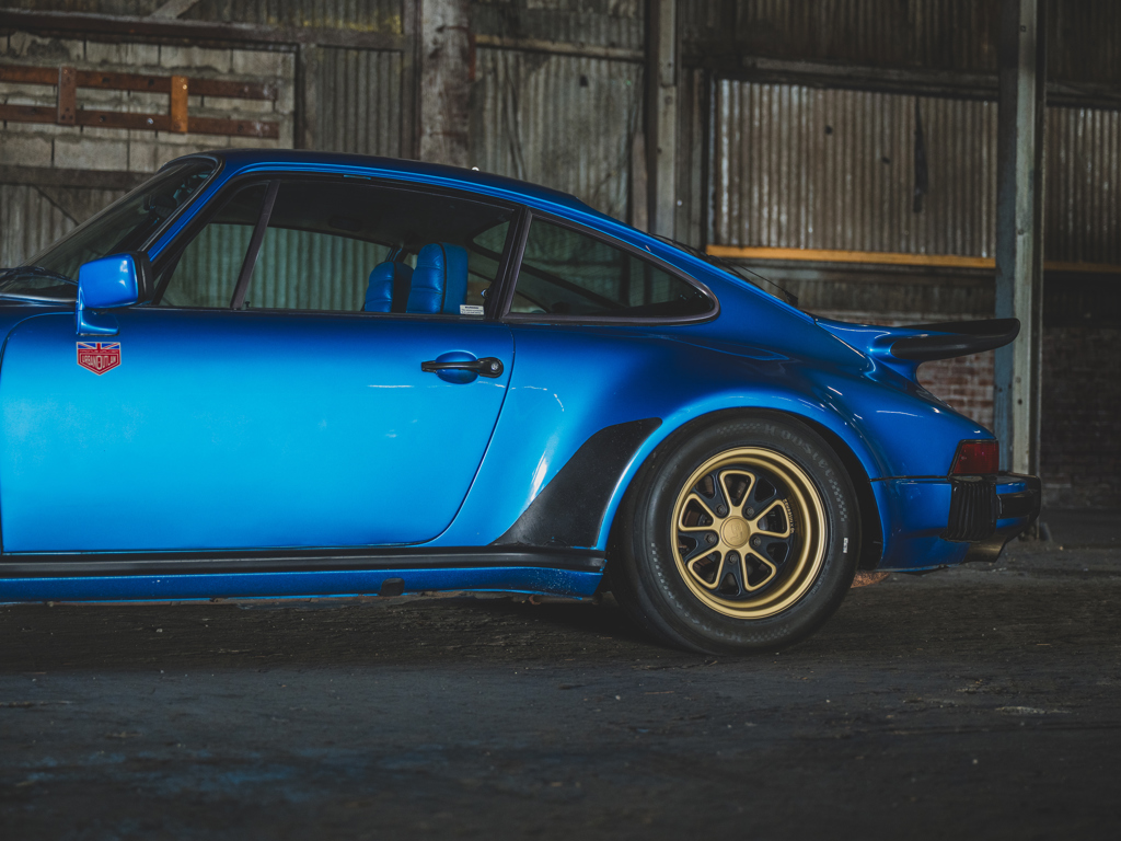 Desirable Swiss-delivery, early production, sunroof-delete 911 Turbo Acquired by Magnus Walker in 2013 and re-finished in a striking interpretation of Minerva Blue Retains numbers-matching 260-hp 3.0-liter turbo engine and equipped with a RarlyL8 Hooligan exhaust Significantly debuted Walker’s collaboration with Fifteen52; fitted with the very first set of their Outlaw Fuchs-inspired wheels