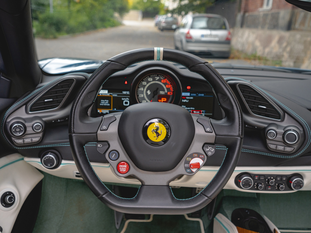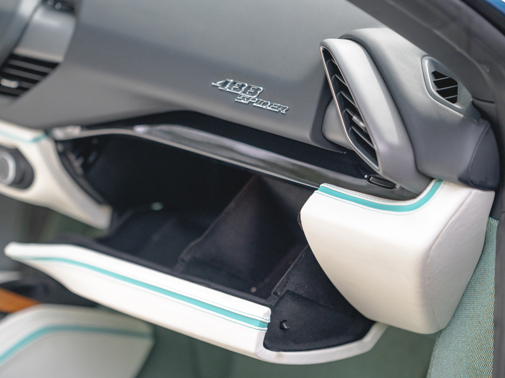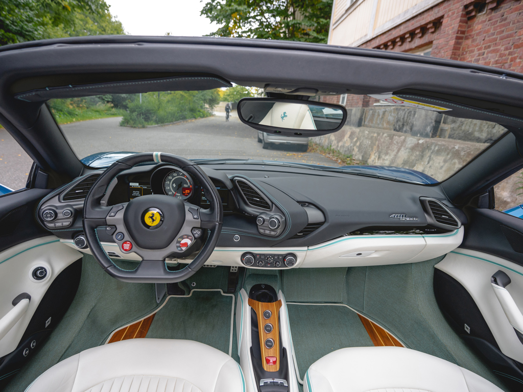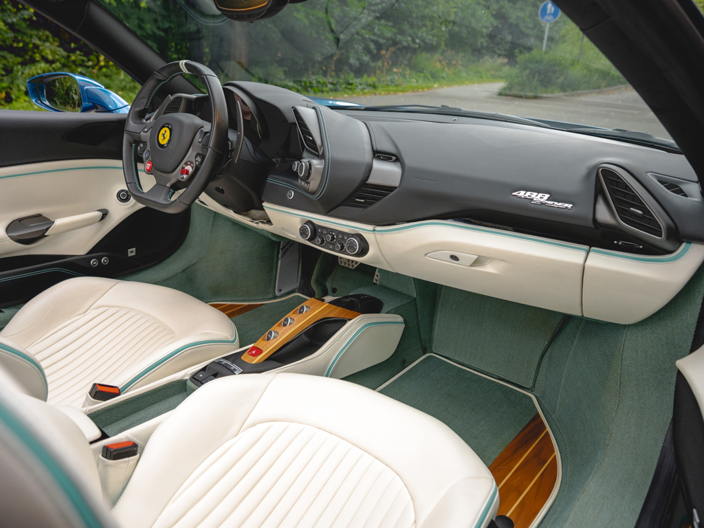 This Ferrari 488 Spider is a Tailor Made example inspired by Riva yachts, featuring a unique color scheme and luxurious interior. Displaying just 9,925 kilometers, it comes with bespoke luggage and service records, offered at auction.