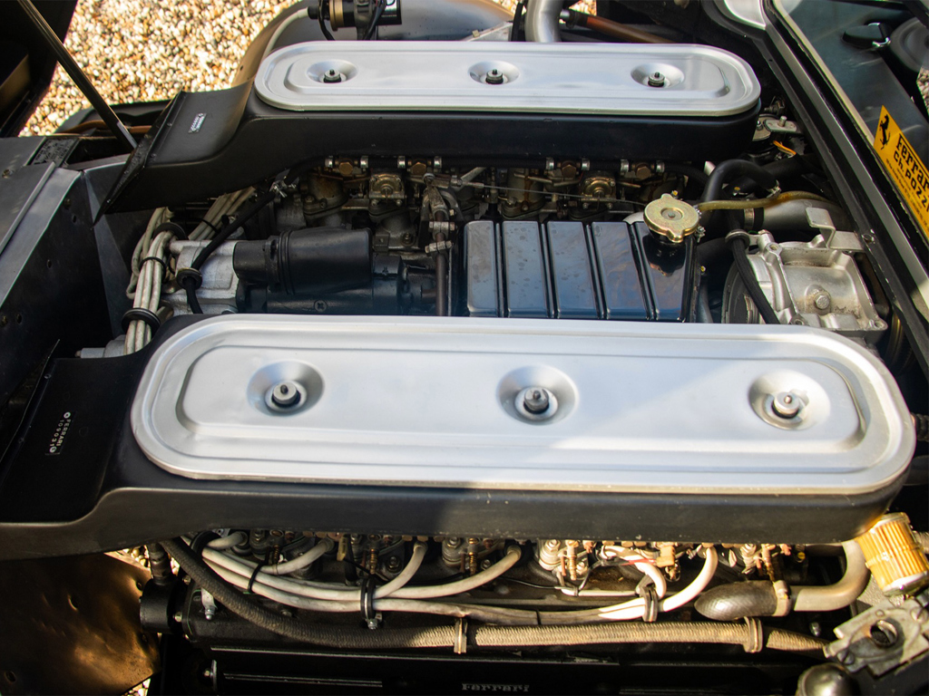 This is the third 512 BB produced, originally Argento Metallizzato with Nero leather. It has had a major engine-out service in spring 2025, including clutch replacement and other maintenance, with over €35,000 spent.