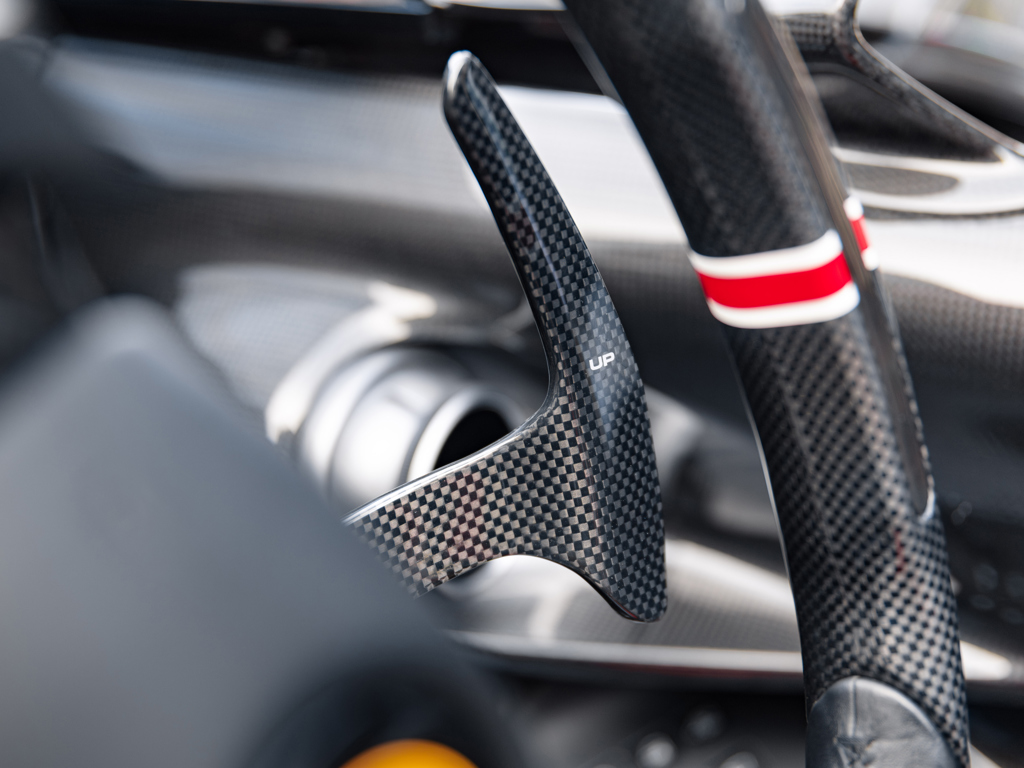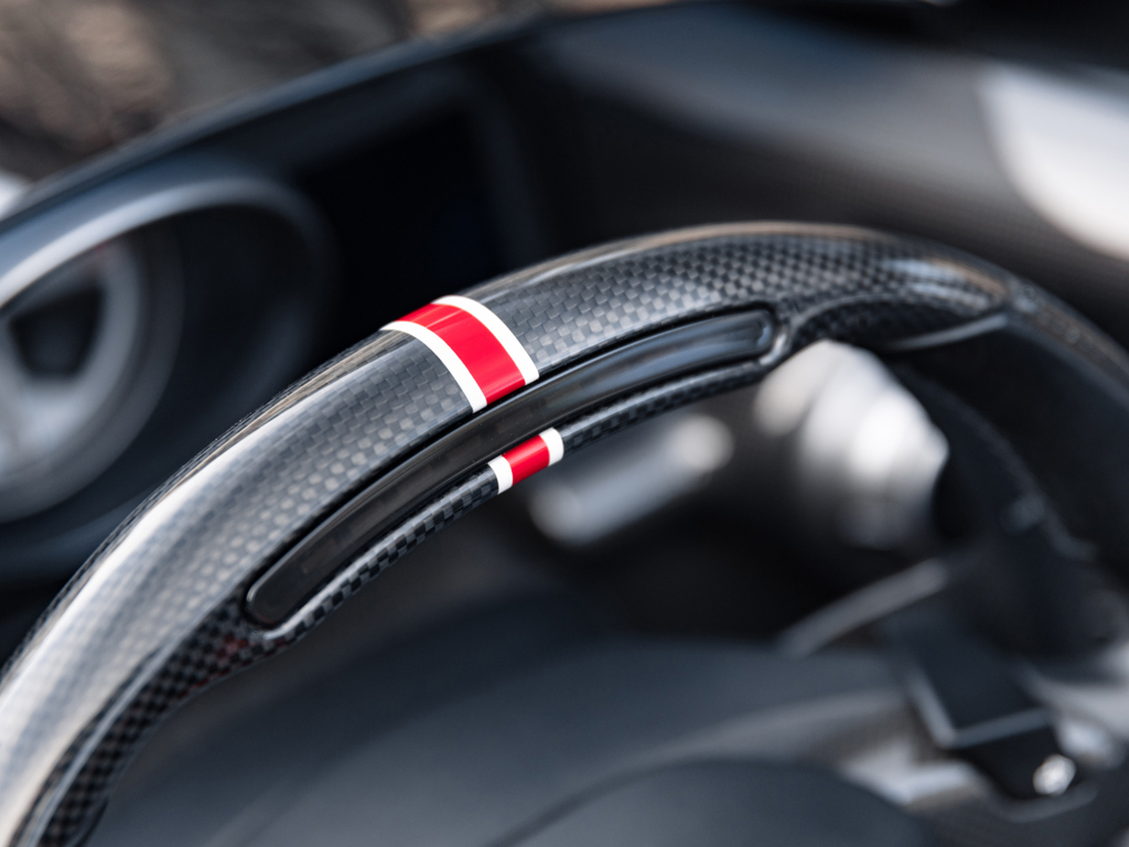The theme is carried through to the interior of the car, where the stripe is duplicated on the steering wheel, and the seats are trimme...