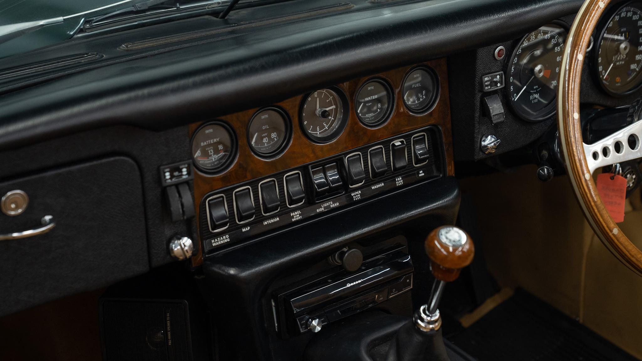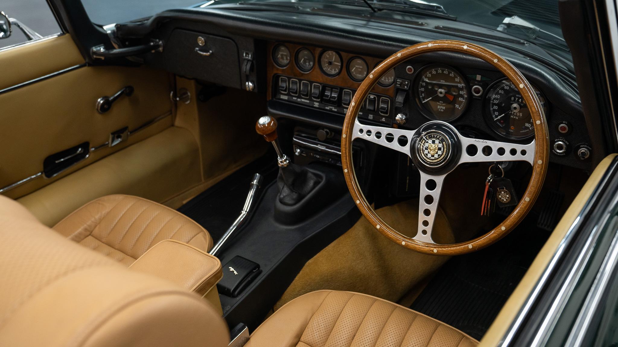 This 1969 Jaguar E-Type convertible has only 34,000 miles and one registered keeper, averaging 630 miles per year. Being offered for £99,950 in Swadlincote, it presents a classic British sports car in green.