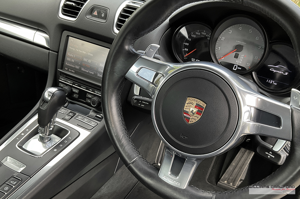 Please slide images to view gallery.|This 2014 model 981 Cayman S benefits from a full service history; 6 in total, the first 2 with Official Porsche Centres (2015 and 2017), the remainder completed here at Williams Crawford (2019, 2021, 2023 and 2025).|Supplied by OPC Bolton in September 2013, specification includes:|Power comes courtesy of a 3.4 litre 6 cylinder driving the rear wheels via the 7 speed PDK (double clutch) transmission.